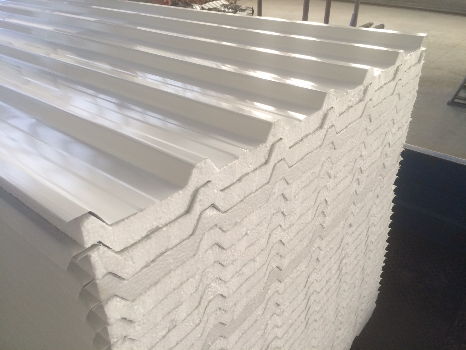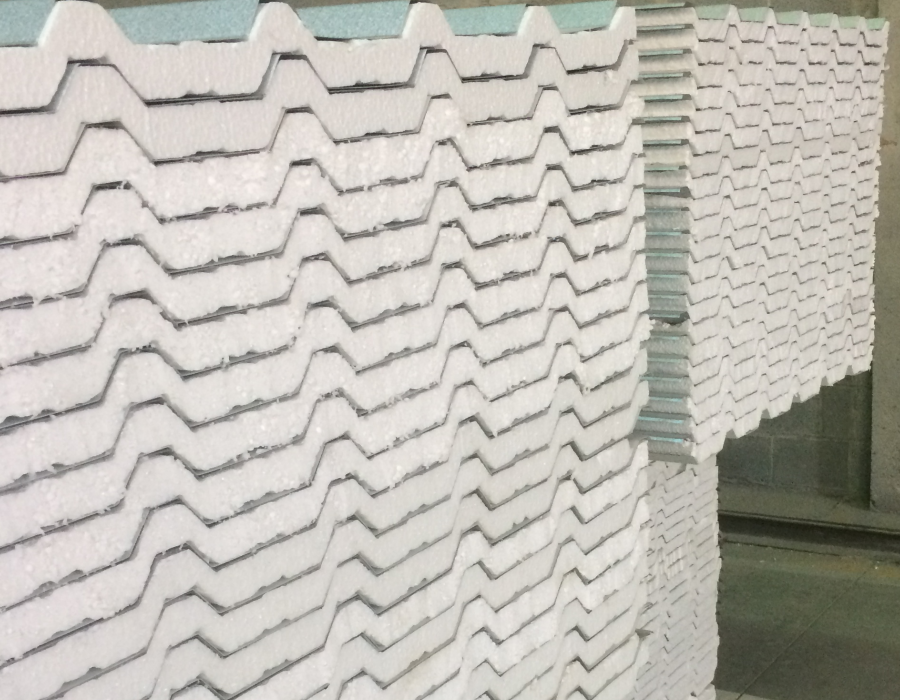Montagem de telhas Termoacústicas em PU e EPS com capacidade produtiva de 1.800mts dia por turno.